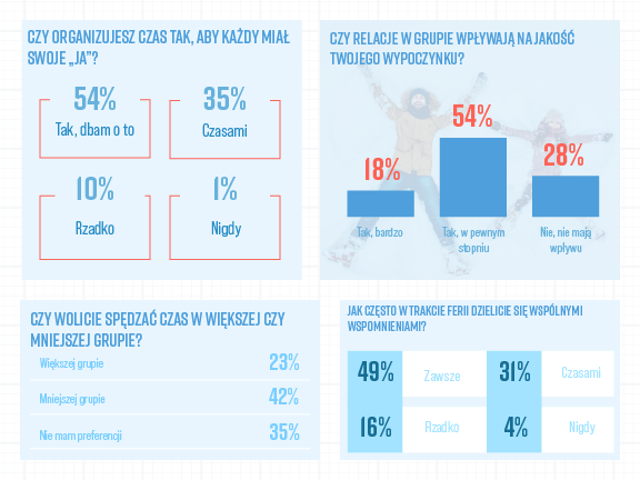 Ulubionym miejscem spędzania ferii zimowych przez dzieci są góry. Najczęściej wyjeżdżają one na kilka dni, a rodzice organizują wypoczynek sami. Ponad połowa Polaków chce w tym okresie spędzać czas z rodziną. Najważniejsze podczas ferii jest zapewnienie atrakcji najmłodszym. Największą wartością wyjazdów zimowych dla rodziców jest aktywność fizyczna.